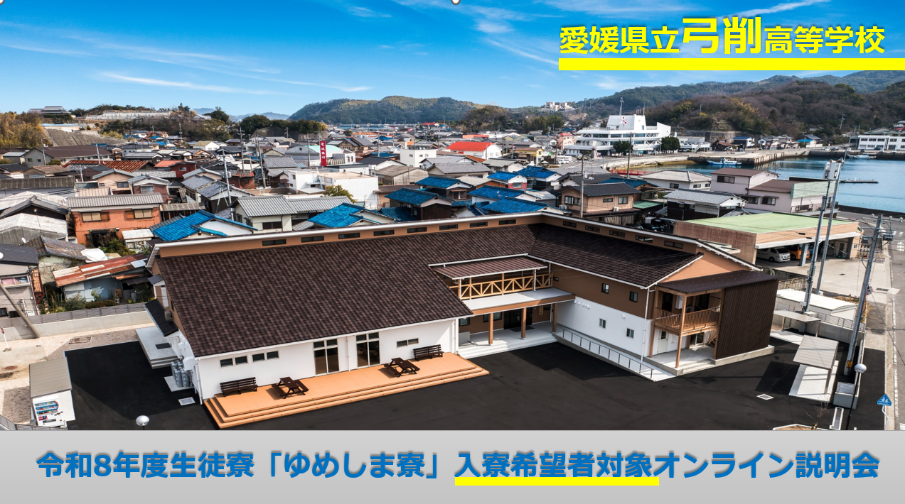 愛媛県立弓削高等学校生徒寮「ゆめしま寮」の令和8年度入寮希望者対象のオンライン説明会です。▼参照HP弓削高等学校学生寮「ゆめしま寮」入寮希望者の募集についてhttps://www.town.kamijima.lg.jp/soshiki/gakko-kyoiku/23258.html※ 応募条件 応募する場合は、以下の2点が必要です。 ・寮に関する説明会への参加(オンライン可) ・応募前面談への参加(オンライン可)入寮希望者対象説明会日程①10月14日(火)【オンライン】19:00~19:40②10月23日(木)【オンライン】19:00~19:40③11月 1日(土)【対面】 14:00~16:00④11月10日(月)【オンライン】19:00~19:40⑤11月19日(水)【オンライン】19:00~19:40ミーティングID:784 915 8983パスコード:zyM09Jお問い合わせ先上島町教育委員会 学校教育課 弓削高等学校学生寮担当Tel 0897-77-2207 Fax 0897-77-3207E-mail kyoiku@town.kamijima.ehime.jp
