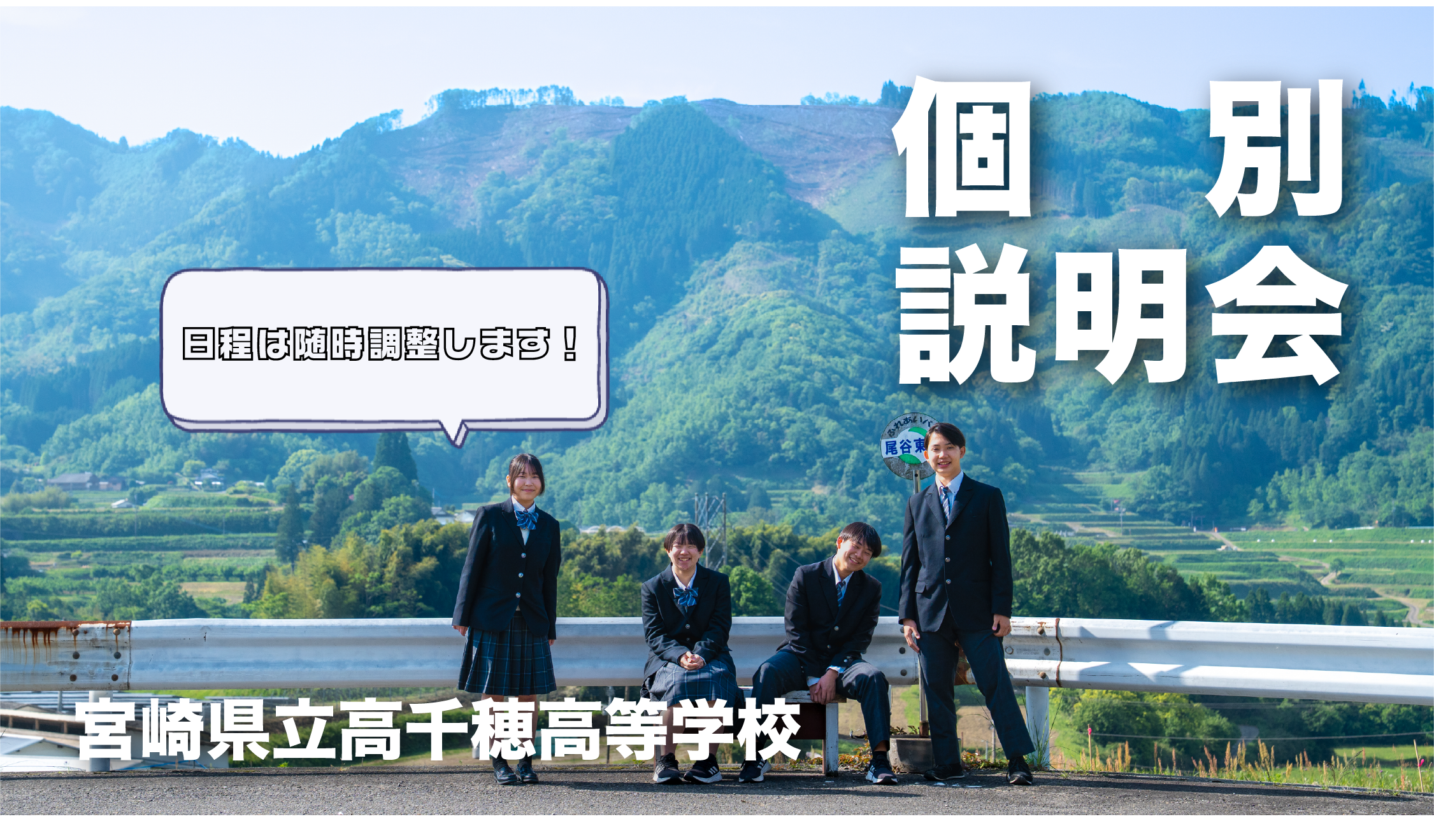 学校説明、個別相談など随時受け付けております。高千穂高校ってどんな高校?高千穂町ってどんな町?どんな経験ができる?住居は?入試についてなどなど、、どんな質問にもお答えします!土日祝日も可能な限り対応しますので、お気軽にご相談ください。お申し込みいただいた方に、個別に日程調整の連絡をさせていただきます。お申し込み後、3営業日以内にこちらからの連絡が無い場合、お手数ですが下記お問い合わせ先までご連絡ください。